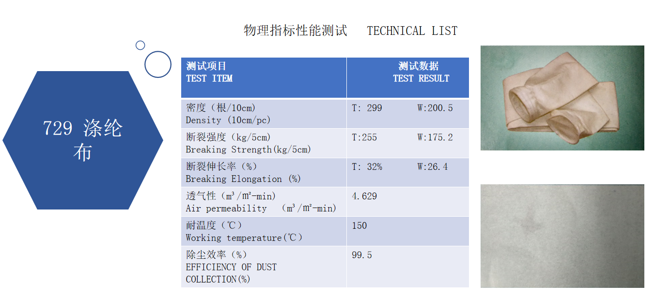 我公司生产的729涤纶布,除尘效率可达99.5%。它的优良性能,为各地用户提供了方便,得到客户的一只称赞。 The 729 polyester cloth we produced can reach 99.5% efficiency of dust collection. Its good performance win customer’s praise.