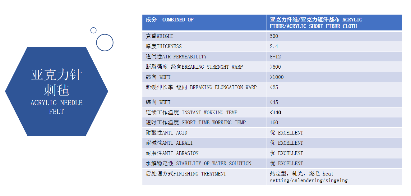 Acrylic needle felt show good resistance to organic solvents, oxidant, inorganic and organic acid when temperature lower than 125 ℃。 Because of this feature acrylic usually use instead of polyester in the low temperature and chemical etching environment. Functional finishing treatment can be made according to special working conditions.