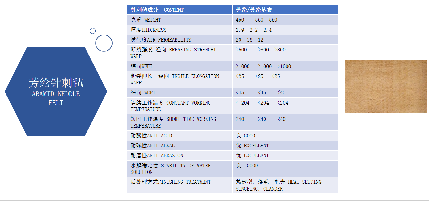 在袋式除尘领域,通常都将布袋比作袋式除尘器的心脏,布袋除尘器能处理什么样的含尘烟气,主要还取决于用来制造布袋的化学纤维本身的条件。一般的烟气温度条件下,只需要布袋能够耐150℃以下的温度,这些场合,涤纶,丙纶,晴纶,锦纶等化学纤维可以基本胜任。而对于烟气温度比较高的场合,如:化工,炭黑尾气,炼铁厂高炉煤气,水泥厂立窑尾气,电石厂窑炉尾气,炼铁厂烟气,沥青混泥土搅拌沥青烟气,耐火砖窑炉烟气,焦化烟气等,一是因为这些粉尘含尘烟气温度粉尘因受比电阻限制不适合于电收尘器收集,只能用布袋或其他方式收集,二是如需将含尘烟气温度降至150℃以下的投资较高或受现场场地的限制,三是因为含尘烟气中因为含有硫的成分,含尘烟气具有酸露点,含尘烟气只能在酸露点以上即温度较高的状态下进行过滤分离等因素,这样就需要有一种能耐受较高温度的化学纤维用来做滤材,我公司采用国际先进标准,用先进设备制造生产了芳纶耐高温针刺过滤毡,按照工况条件的不同要求,我公司可对芳纶耐高温针刺毡做各种功能性处理,如拒水防油,PTFE浸渍,涂层,覆膜等。