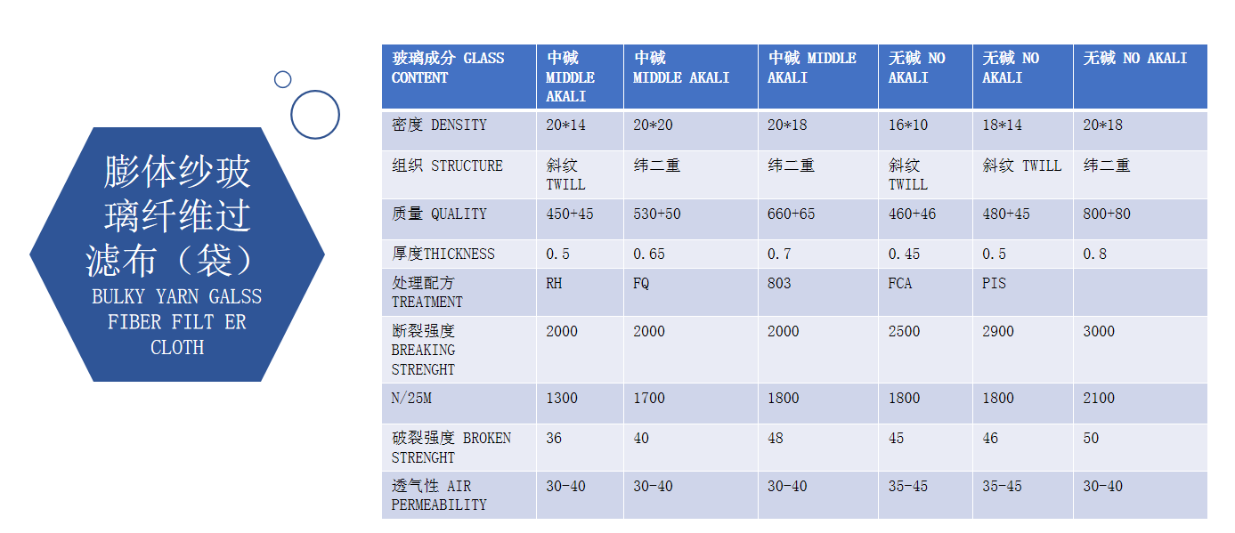 玻璃纤维膨体砂滤材其纬纱经过部分或全部膨化纱组成由于纱线蓬松,覆盖能力强,透气性好,过滤效率较平幅过滤布高,除尘效率可达99.3%。过滤速度在0.6-0.8米/分。广泛应用在反吹风滤袋器中。 Bulky Yarn Glass fiber felt partly or wholly combined by bulky yarn silk. Bulky have such features as fluffy, wide cover, good air permeability,high filtration efficiency reach 99.3%, filtration speed reach to 0.6 -0.8m/min. Widely used in blow black bag filter. 适用于:水泥,炭黑,钢铁,冶金,石灰窑,燃煤等。 Application to : cement, carbon black, steel, metallurgy, limekiln, coal-fired and others.