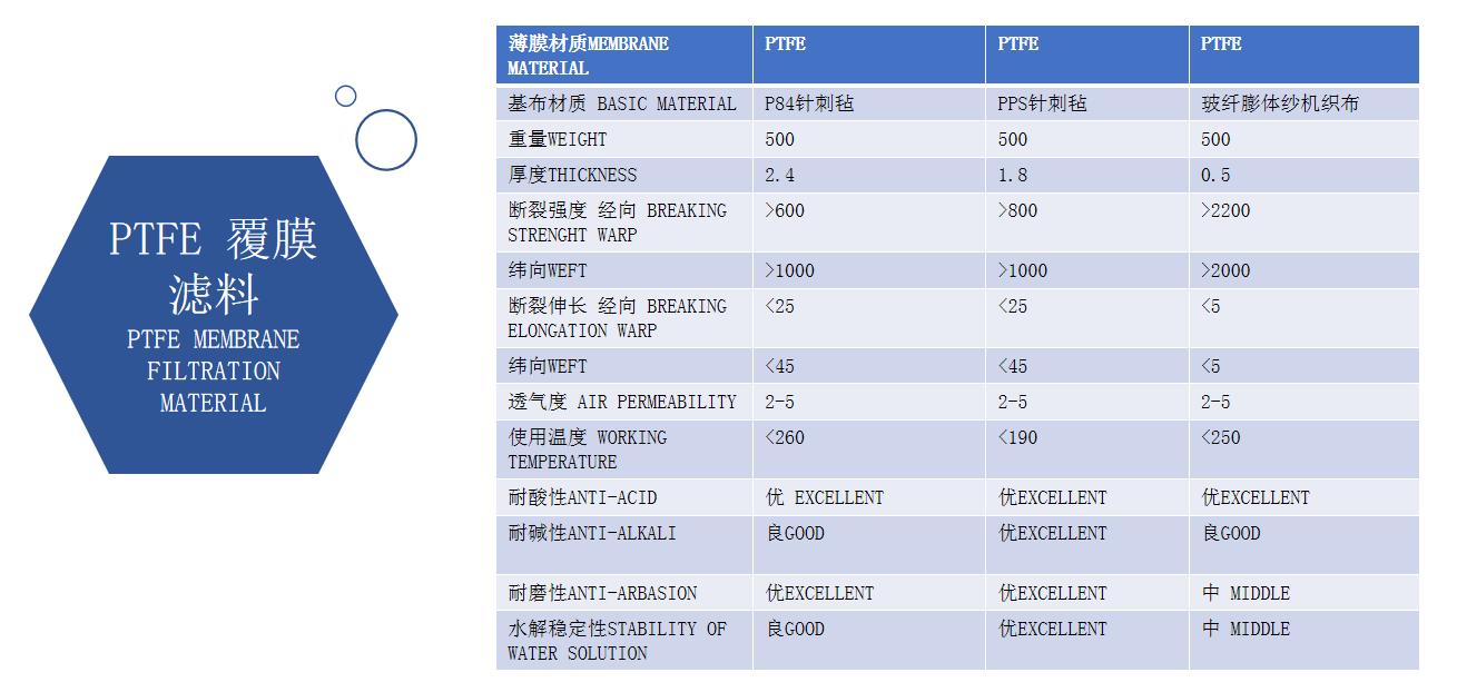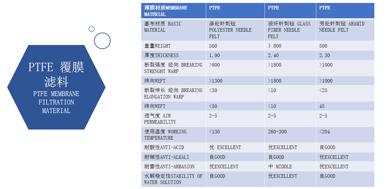 聚四氟乙烯(PTFE) 薄膜表面光滑且耐化学物质,将其覆合到普通过滤材料的表层,起到一次性粉尘层的作用,将粉尘全部截留在膜的表面,实现表层过滤,又因该膜表面光滑,有极佳的化学稳定性,不老化,又憎水,使截留在表面的粉尘很容易剥落,同时提高了滤料的使用寿命。 Smooth surface , anti chemical substance, cover it to surface of common filtration material to play a role of disposable dust, keep dust to stay in the surface , to realize the surface filtration. Excellent chemical stability because of enough smooth surface. Because of no aging and water-hating the surface dust easy to spall. Filter cloth using life extended. 与普通滤料相比,其优点有: 1.薄膜孔径在0.2-3um之间,过滤效率均能达到99.99%以上,几乎实现零排放。清灰后不改变孔隙,除尘效率一直很高。 Film bore diameter between 0.2 to 0.3 um, above 99.99$ filtration efficiency, near to zero emission. No change on pore after cleaning. Always keep high efficiency of dust collection, 2.覆膜滤料在开始使用时,压力损失要高于普通滤料,但在投入运行后,压力损失随时间的增加变化却不大,而普通滤料的压力损失会随时间的延长而越来越大。 Pressure loss higher than common filtration material at the beginning. Pressure loss increase as time past , pressure loss of common material will be higher and higher as time passed.