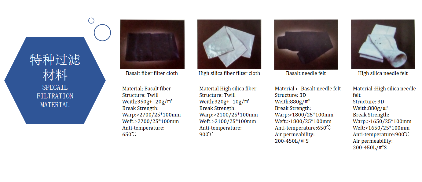 本系列产品是采用我公司开发的超高温特种纤维进行织造或针刺而成的特种过滤材料,产品包括:玄武岩纤维布、玄武岩针刺毡、高硅氧纤维布和高硅氧针刺毡。该系列产品使用于特种行业超高温烟气过滤作业,以及超高温防火、耐温、耐烧蚀领域。